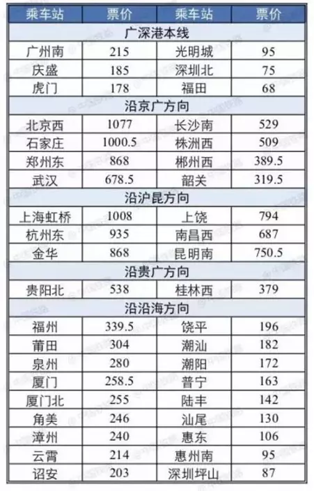 內地主要車站至香港西九龍二等座票價表(人民幣)