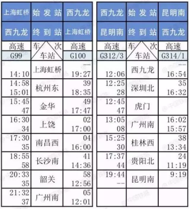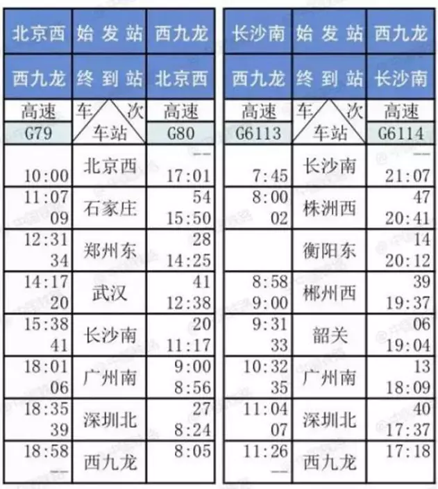 香港西九龍高鐵列車時刻表
