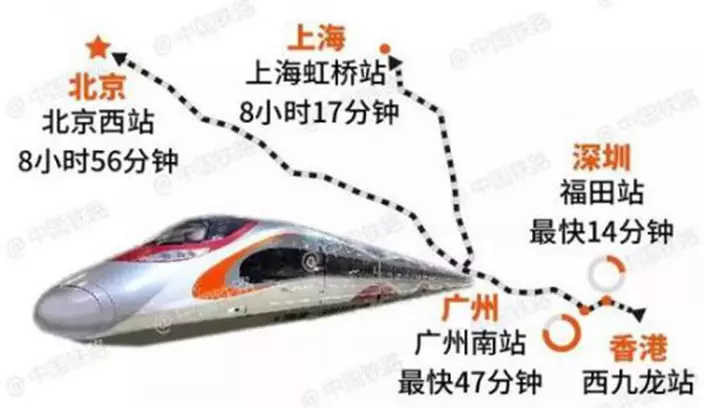 廣深港高鐵香港段開通運營後,可通達北京、上海、石家莊、鄭州、武漢、長沙、杭州、南昌、福州、廈門、汕頭、貴陽、桂林、昆明等城市,到達內地40多個車站,將大大拉近香港與內地城市間的時空距離。其中,從香港西九龍站出發,至深圳福田站的列車最短運行時間14分鐘,至廣州南站的列車最短運行時間47分鐘,至上海虹橋站的列車運行時間為8小時17分鐘,至北京西站的列車運行時間為8小時56分鐘。