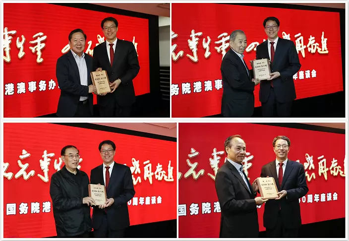 張曉明向多位前港澳辧副主任頒發紀念牌,左上為陳佐洱,右上為陳滋英,左下為王鳳超,右下為周波。