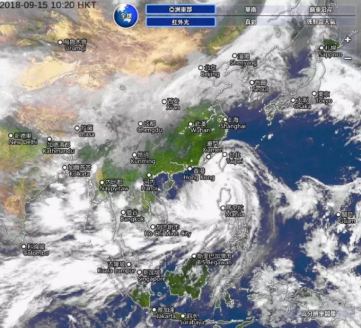 「山竹」已橫過呂宋,進入南海北部,並維持超強颱風強度,迅速移向廣東西部沿岸一帶。由於山竹環流廣闊,風勢猛烈,對該區構成嚴重威脅。在本港,高地已開始間中吹強風,天文台會在下午稍後改發三號強風信號。