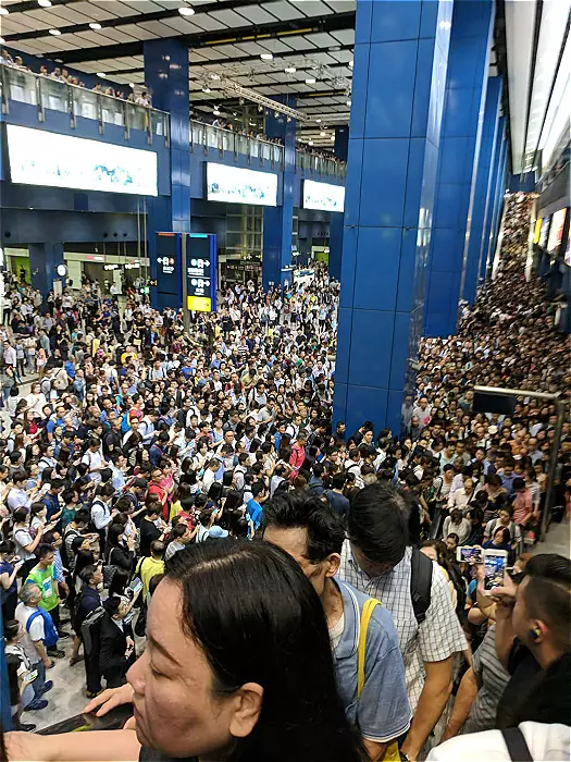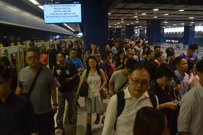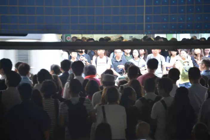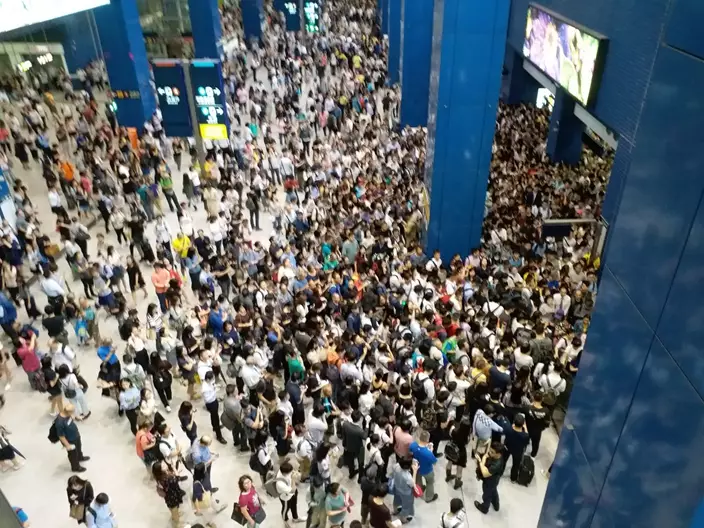 受「山竹」影響,本港路面情況惡劣,交通服務嚴重受阻,在九日日間停駛下,一眾打工仔湧至乘搭港鐵上班。東鐵線各站人頭湧湧,其中大圍站情況嚴重,逾千市民逼滿大堂樓梯及閘口。