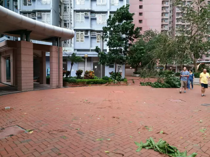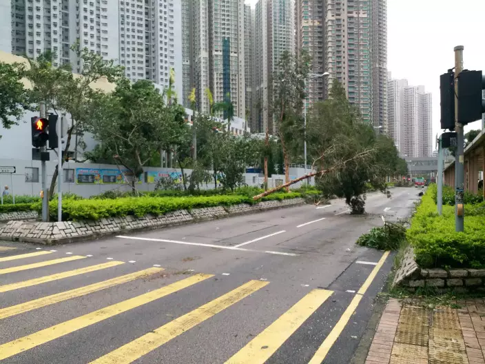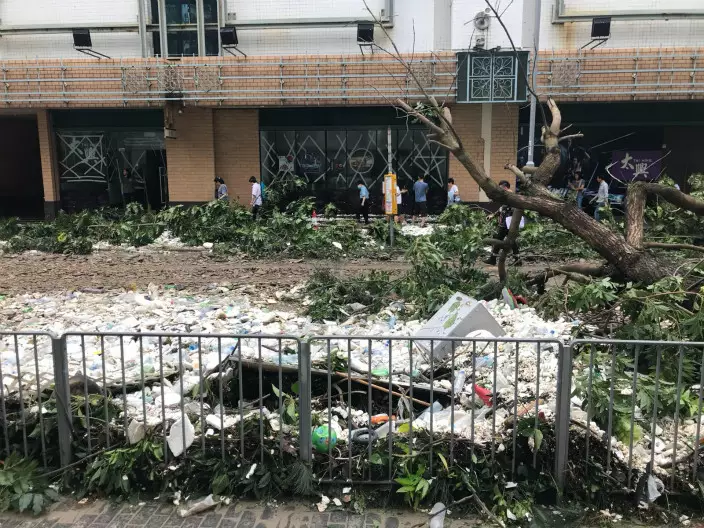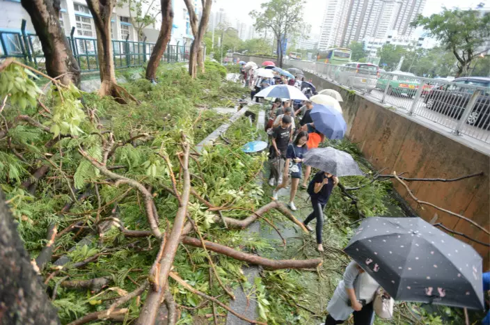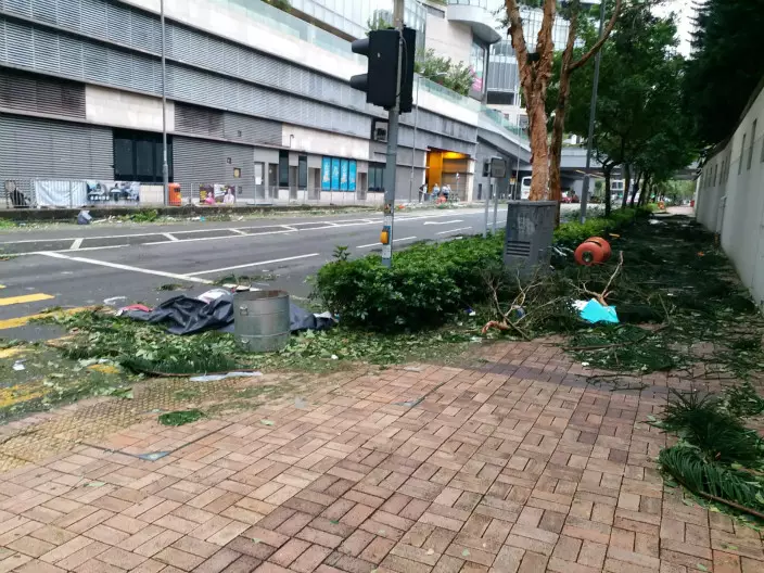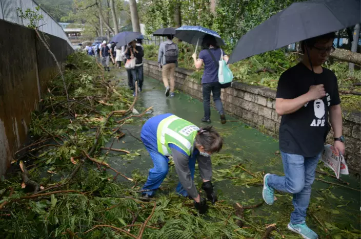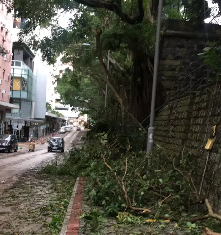 「山竹」吹襲本港,多區出現塌樹情況。其中堅尼地城科士街逾百年歷史的石牆樹,大量樹椏折斷塌下,橫亘路邊。而重災區之一的將軍澳,狂風暴雨下有多處地方有大樹倒塌。