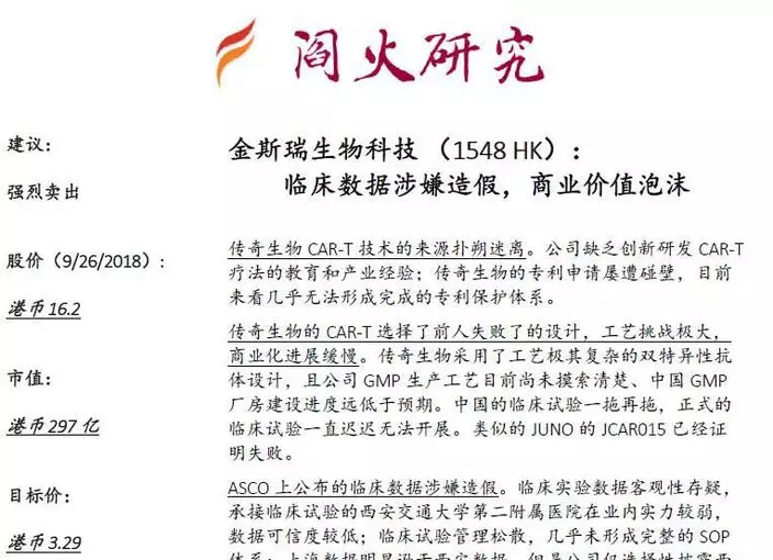 閻火研究昨日發布沽空報告指出,金斯瑞生物科技缺乏創新研發CAR-T療法的教育和產業經驗。