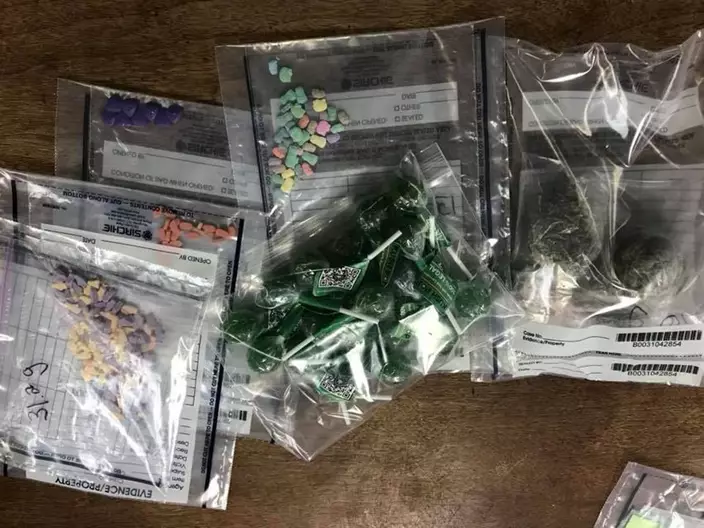 據報道,哈普維爾(Hapeville)警局於21日處理一起車禍毒品案件時,發現一名嫌犯負傷後逃離現場,並發現了其留下的電腦包內藏有兩把手槍、現金、可卡因、大麻,以及一批內含大麻及海洛因的的各色糖果與棒棒糖。