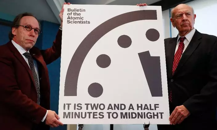 距離象徵人類滅亡的午夜12時僅剩兩分半鐘。(AP相)