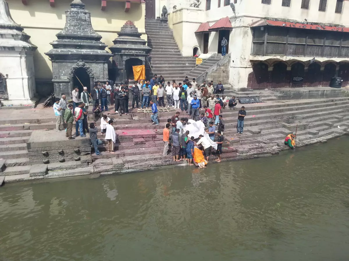 早上十時,我們三個同事到了加德滿都東面的「濕婆神廟」,又稱為帕斯帕提那寺(Pashupatinath),尼泊爾人叫這裡做生命最後的歸處。這裡最特別的地方,並不是只准印度教徒進入的神廟,而是神廟外Bagmati河畔的燒屍儀式,沒錯,是燒屍儀式。我們在未進入神廟時,就有很多「導遊」對我們說:「想看燒屍(burning body)嗎?已經開始了,快快快!」一到達Bagmati河畔時,我立刻被眼前的景象嚇呆了。只見一件件屍體在一座座河邊的燒屍台上,有的已經燒完,有的燒至一半,有的還被蓋上乾草,等待著儀式的進行,我還看見一具屍體被家人放入河中沖擦。根據網上資料說,火葬前,死者的長子會在河邊剃光全身毛髮,走進河中淨身,舉行簡單的儀式後,用白布包起死者的遺體,然後在河邊的平台上搭起架子火化,焚燒後的骨灰灑入河中,而長子還需吃齋禁慾13天,因為他們相信這樣做,死者的靈魂才能離開軀體,融入神界。