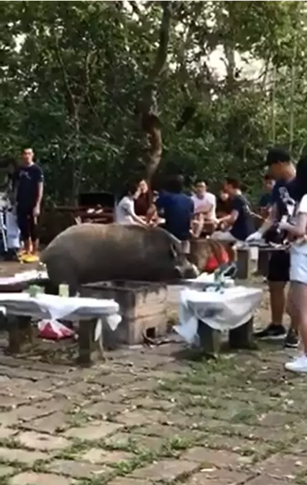 野豬直闖燒烤場期間,惹來不少遊人圍觀。影片截圖