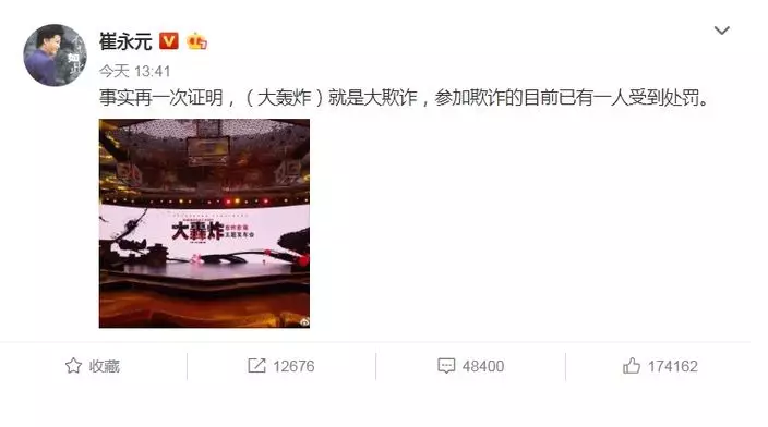 崔永元在微博發出涉及「陰陽合同」的電影《大轟炸》宣傳照,稱《大轟炸》)就是大欺詐。網上截圖