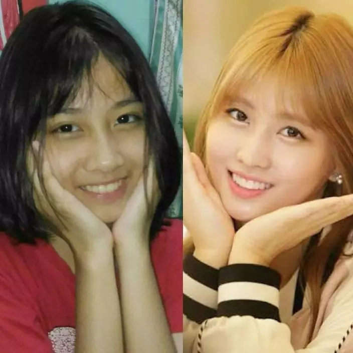 不少網友甚至做了兩人的對比圖,這位印尼少女的有時羞澀的笑跟以前的Momo很像,也令人誤以為Momo以前的相曝光。