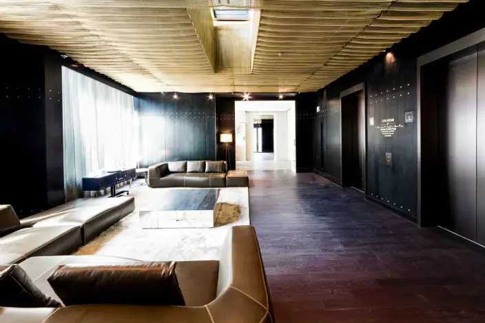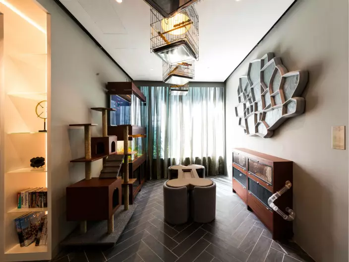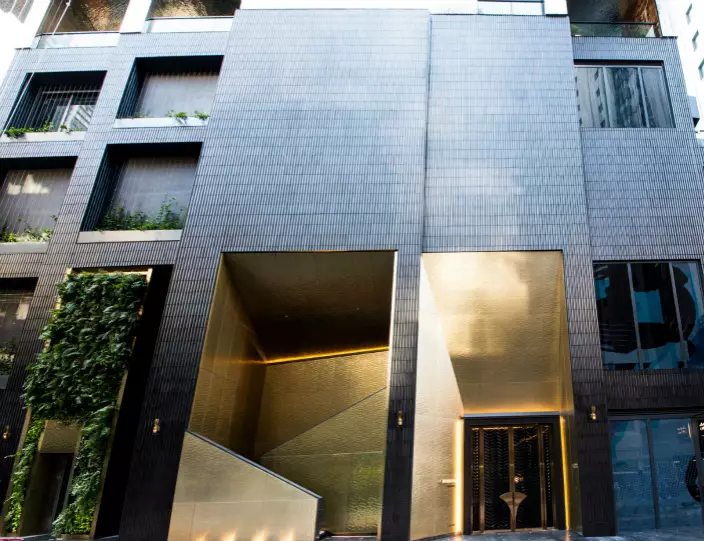 物業基座以碳灰啞色瓷磚包裹,與周邊建築和諧融合,配合金色金屬物料為大門點綴,於沉穩中提供指引,顯出設計心思;大堂天花同樣以金色金屬物料為配襯,以方矩陣形式排列,與大門互相呼應。會所則由三位著名的當代藝術家王墒、王浩然(Adrian Wong) 及楊嘉輝(Samson Young)共同策劃。