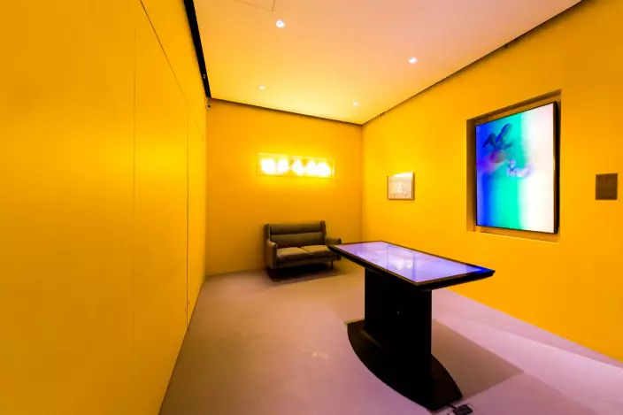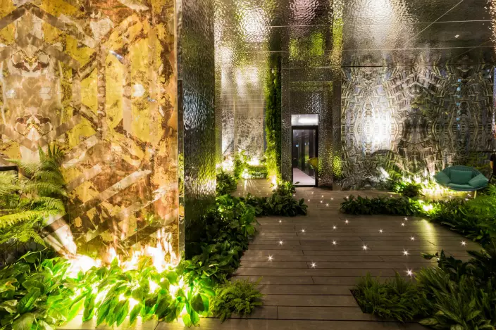曾於2017 巴塞爾藝術展獲選為「藝創宣言」展區的多媒介藝術家王墒:「《輪葉山》設計概念源於樹葉的細胞脈絡,引用植物層層相疊的六邊形的周邊組織探索及建築關係,打造成一個關注人類與大自然共存的地方,作品利用大理石的表面紋拼湊出具豐富層次的圖案。