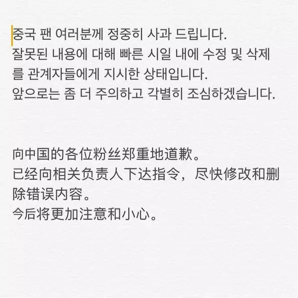 YG社長梁鉉錫的instagram隨即遭內地網民留言轟炸,要求對中國道歉;勝利的ig亦一樣被轟。傍晚時份,梁鉉錫貼出韓、中語致歉,「向中國的各位粉絲鄭重地道歉。已經向相關負責人下達指令,盡快修改和刪除錯誤內容。今後將更加注意和小心。」但發文似未能平息內地網民不滿,認為「應向中國道歉,不只是中國粉絲」,也有認為「這個敷衍的道歉是二次羞辱,絕不接受」。
