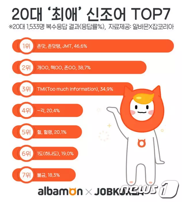 韓國網民特別是年輕一代,都喜歡用很多新起的網絡用語。作爲海外韓粉,有時候看綜藝或是SNS上的網紅、站姐等更新時,不難接觸到這類連字典也查不到意思的新造詞。最近就有機構調查了1533名20代(即20歲以上,30歲以下)網民最愛使用的新造詞,一起來認識一下吧!