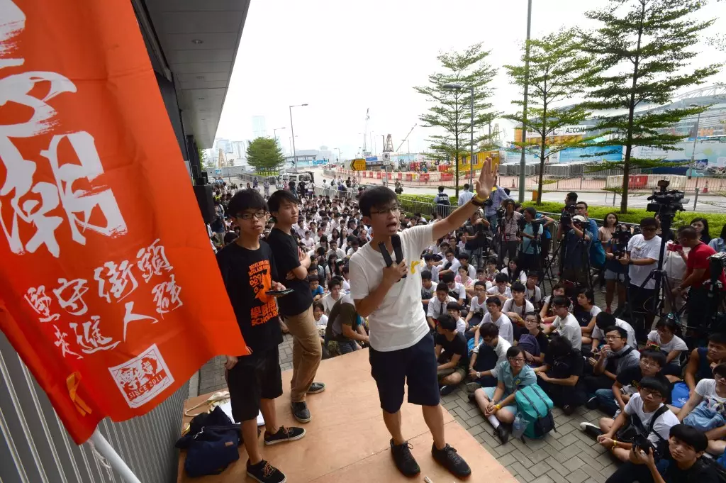 黃之鋒在台上宣讀罷課宣言,強調罷課並非罷學。有學生舉起自製橫額,指提名委員會保留四大界別,壓迫最終只會變本加厲。