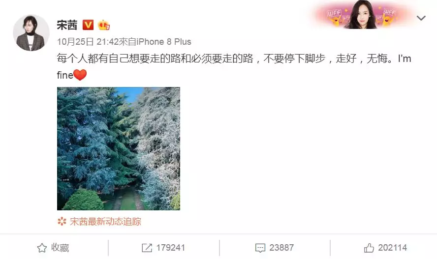 昨日(25日)f(x)隊長宋茜就在個人微博發帖表示:「每個人都有自己想要走和必須要走的路,不要停下腳步,走好、無悔。I’m Fine」,最後更加上一個心型的符號,整段說話就像在回應雪莉,並安慰粉絲多年來的遺憾。