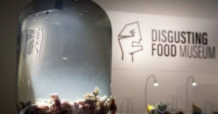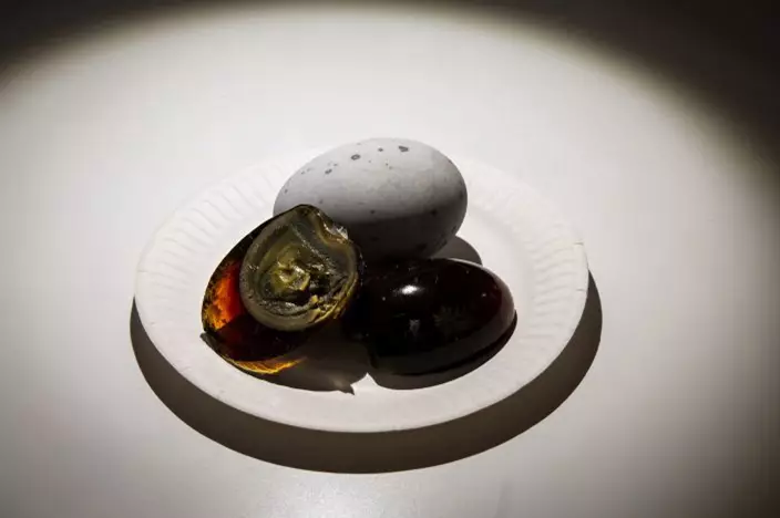 皮蛋也是展品之一。將雞蛋或鴨蛋保存在粘土,生石灰,鹽和稻殼的混合物中數月。蛋白變成黑色半透明果凍,蛋黃變成深綠灰色粘液。(AP圖片)