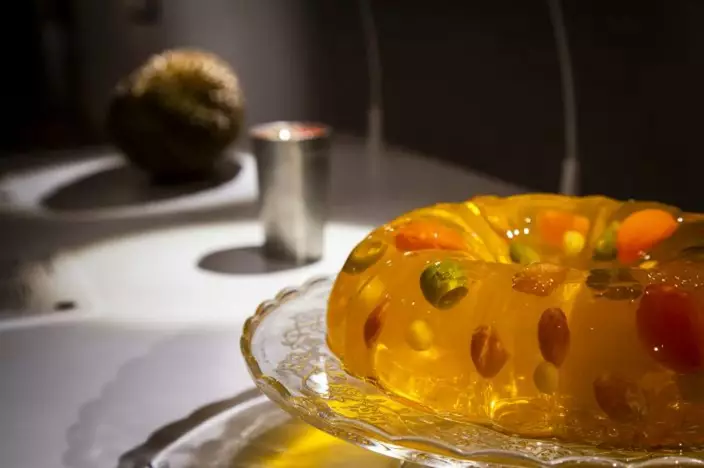 Jello-O-Salad。用糖果味明膠的Jell-O製成。在60年代被認為是美國的傳統。材料有番茄湯,蛋黃醬,奶油芝士,蔬菜,香腸,橄欖或其他可懸浮在五顏六色的果凍中的成分。(AP圖片)