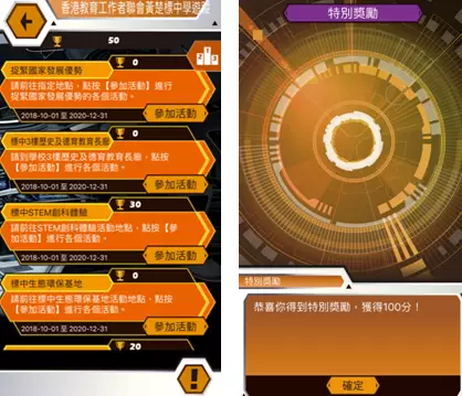 粵港澳大灣區及一帶一路等概念對於初中學生而言,可能只是經常聽聞的名詞,卻未必有深入認識。為了燃起學生對此題目的學習興趣,有學校與香港意學教育科技有限公司合作,在校園及學校附近設置100個活動點(藍牙裝置),學生只要透過手機或平板電腦,開啟相關的應用程式便能掃瞄活動點,然後挑戰預設的任務和答題以獲取分數(圖一),令學習猶如「打機」般充滿趣味和刺激,深受學生們喜愛。
