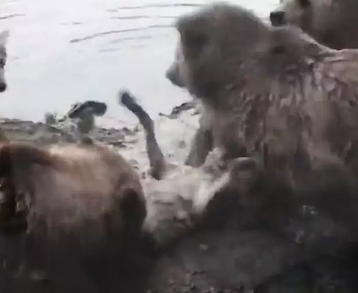後來他看到狼群瘋狂奔向水面,當時棕熊已經和其中一隻狼打在一起,他起初以為牠們一直在玩,直到看見一個狼的頭顱,他才帶走了自己的孩子。