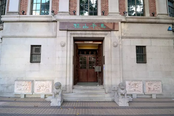 馮平山樓的正門近景,花崗石門圍上附有優美的古典飾邊。