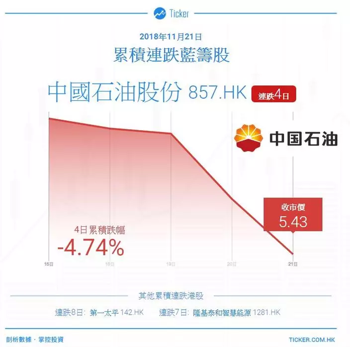 中石油(857)股價已連跌四日,累跌4.74%;今天收報5.43元,跌1.99%或0.11元,成交額7.49億元。