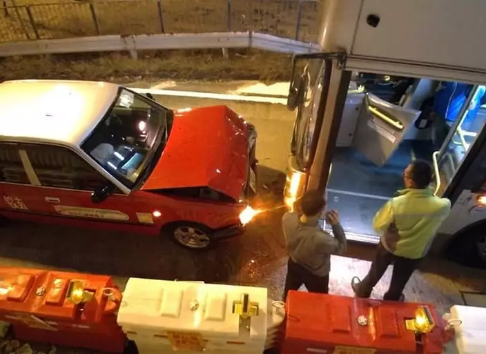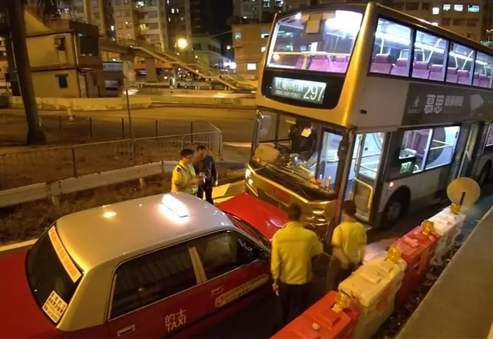 事發在昨晚10時許,一名43歲姓吳司機駕駛空載的士,沿新山道駛上東九龍走廊,駛至支路前疑路面正進行工程,現場放有「水馬」,司機疑不慎入錯對面行車線。期間一輛往紅磡碼頭的297號線九巴駛至,58歲姓朱車長見的士逆線駛至,收掣不及,兩車迎頭相撞。