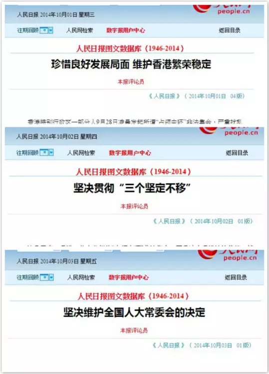 而人民日報一連三日發表評論員文章,前日的文章題為《珍惜良好發展局面維護香港繁榮穩定》,批評佔中破壞香港社會根基,指佔中不是溝通而是對抗;又指如今極少數人執意對抗法治挑起事端,終將自食其果,希望香港社會各界珍惜和維護香港穩定發展的良好局面。