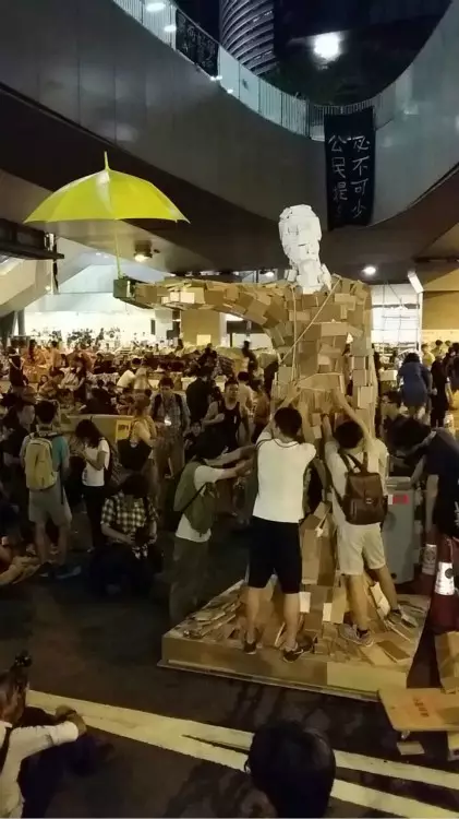 年青人十分歡迎雨傘人,但年齡稍大的「民主老鬼」一見,心中就發毛,想起天安門的民主女神像。神像於89年5月30日在天安門廣場豎起,4天之後,軍隊武力清場,推倒女神像的一幕,成為經典畫面。
