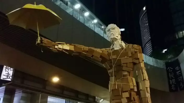 一個雨傘人雕像,送抵金鐘,由一班藝術工作者用多天時間製作,其中一個創作者的名片寫著藝術工作者Milk。雕像未有名稱,創作者說,這並不是神像,也不是抗爭道具,只是一件藝術品。