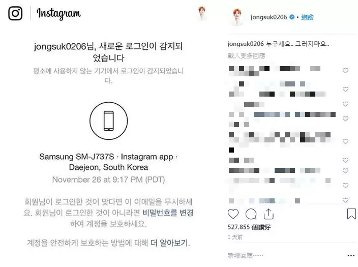 李鍾碩在Instagram上載了一張手機截圖,内容顯示有人試圖以其他裝置登入李鍾碩的Instagram,而李鍾碩則留言:「你是誰……不要再這樣了……」