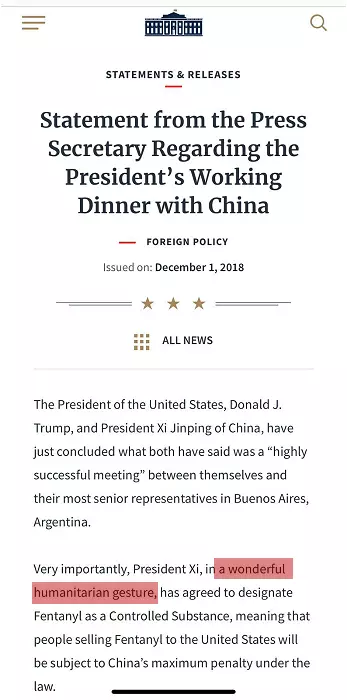 第二,聲明接著提及會議的重要成果,先不說貿易,而是說中國習主席擺出神奇的人道主義姿態(a wonderful humanitarian gesture),同意管制類似鴉片止痛藥芬太尼(Fentanyl)向美國出口,美國人多濫用止痛藥,據說每年有8億美元的芬太尼透過郵購從中國出口到美國。中國此舉有助防止美國人濫藥。