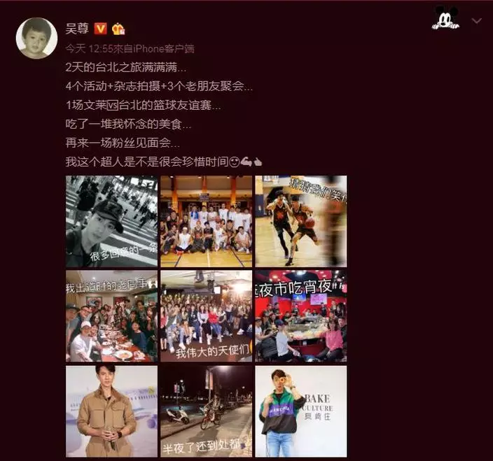 另外,吳尊亦在社交網站發文,分享這次台灣之旅:「2天的台北之旅滿滿滿...4個活動+雜誌拍摄+3個老朋友聚會...1場汶萊對台北的籃球友誼賽...吃了一堆我懷念的美食...再來一場粉絲見面會...我這個超人是不是很會珍惜時間」。