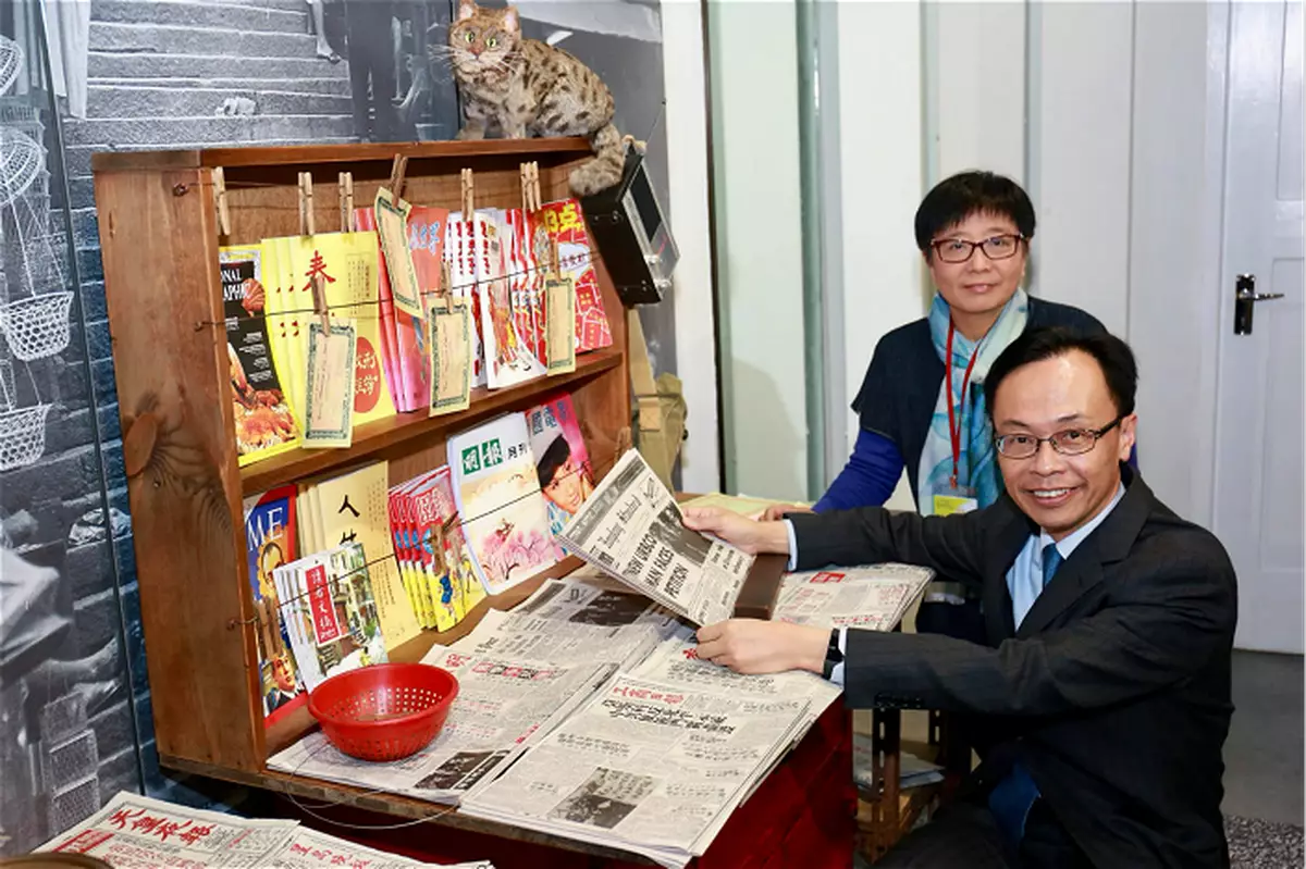 圖:聶德權和新聞博覽館副主席陳淑薇(後)在新聞博覧館的「舊報攤」前留映。