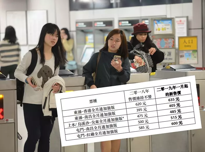 另外,「全月通加強版」亦將於明年1月起加價,「東涌–香港全月通加強版」將由620元加到635元;「東涌–南昌全月通加強版」由395元加到405元;「上水/烏溪沙–尖東全月通加強版」由475元加到485元;「屯門–南昌全月通加強版」由500元加到515元;「屯門–紅磡全月通加強版」則由585元加到600元。