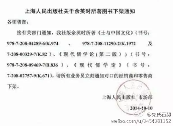 網上流傳多家出版社收到將余英時及九把刀等作品下架的通知。(新浪微博圖片)