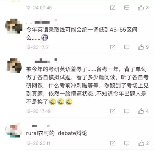 23日,2019年全國碩士研究生招生考試初試環節告一段落。本次考研初試中,有關英語科目難度的話題引發了網友熱議,試題中的兩個單詞「rural」和「debate」甚至上了微博熱搜榜。