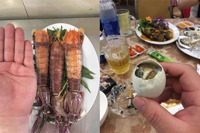 領隊帶著團員大啖超補的當地美食,包含鴨仔蛋、瀨尿蝦等料理。(圖/翻攝自Dcard)