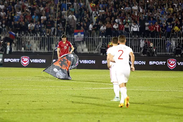 塞爾維亞後衛米祖域,將國旗扯下來,他隨即被多名阿爾巴尼亞球員包圍,雙方球員互相推撞,並引發看台上有球迷衝落球場,球證吹停比賽,歐洲足協其後宣布賽事腰斬。