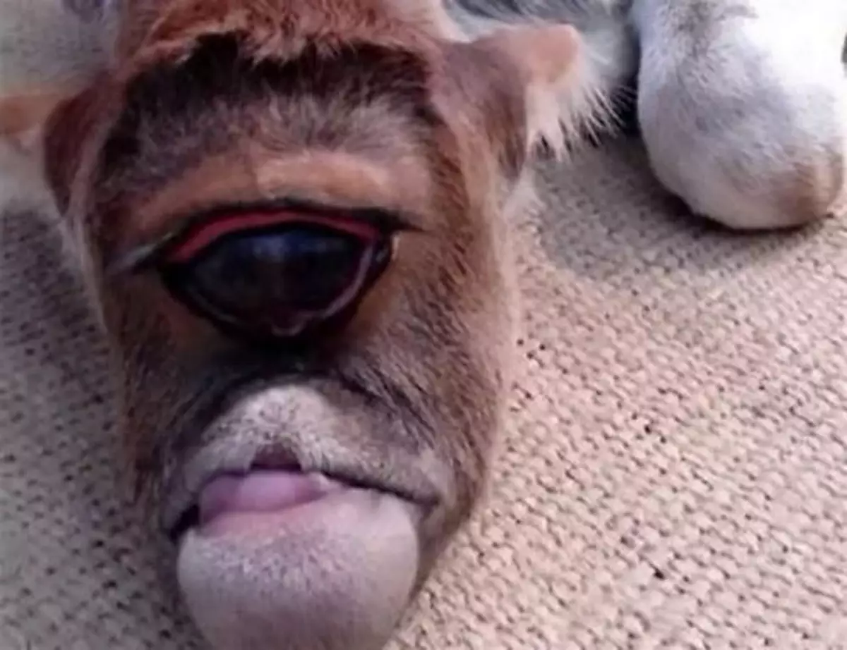 這隻罹患「獨眼畸形症」的小牛,除了只有一隻眼睛外,它也沒有鼻子,只能靠嘴巴呼吸,這隻牛患的是罕見先天疾病,因為胚胎初期在子宮發育不完全,導致大腦左右半球沒有正常分裂,依照嚴重程度可能會造成不同狀況,輕則智能障礙、運動障礙,重則臉部分裂發育中止,出現眼球分離或是融合,但通常都沒有睫毛、眼瞼,鼻子可能畸形,上顎也會發育不全。