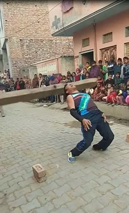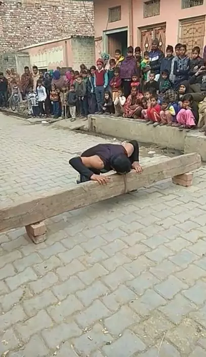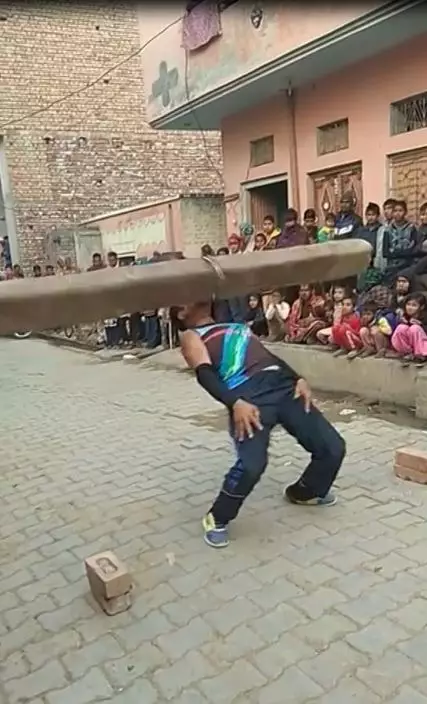 用雙手舉起巨木不簡單,更何況用牙齒!印度北部一名街頭賣藝的男子,只用牙齒就咬起了一條60公斤(約130磅)的木頭,還將它甩上天從頭上飛過!博得現場觀眾一陣掌聲。