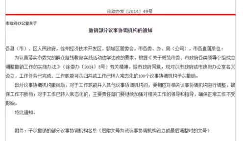 而在同年2月,江蘇省政府辦公廳下發《關於撤銷部分議事協調機構的通知》,撤銷了56個省級議事協調機構,為各市縣作了表率。