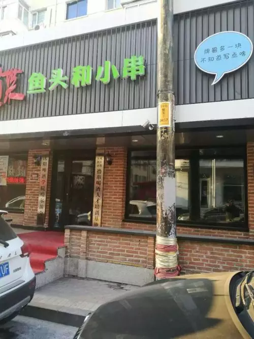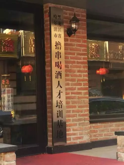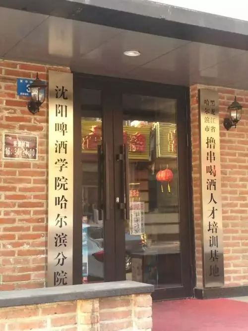 日前,記者來到位於哈爾濱南崗區復華地區的這家「喝酒培訓基地」,發現這是一個臨街的店鋪,門臉上掛著「XX魚頭和小串」的大牌匾,而門兩側各掛起一塊豎匾,右側牌匾寫著「黑龍江省哈爾濱市擼串喝酒人才培訓基地」,左側牌匾則寫著「瀋陽啤酒學院哈爾濱分院」。