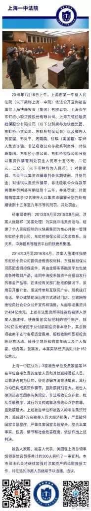 2019年1月16日上午,上海市第一中級人民法院(以下簡稱上海一中院)依法公開宣判被告單位上海快鹿投資(集團)有限公司、上海長寧東虹橋小額貸款股份有限公司、上海東虹橋融資擔保股份有限公司(以下分別簡稱為快鹿集團、東虹橋小貸公司、東虹橋擔保公司)以及被告人黃家騮、韋炎平、周萌萌、徐琪(美國籍)等15人集資詐騙、非法吸收公眾存款系列案件,對快鹿集團、東虹橋小貸公司、東虹橋擔保公司分別以集資詐騙罪判處罰金人民幣十五億元、二億元、二億元(以下幣種均為人民幣);對黃家騮、韋炎平以集資詐騙罪判處無期徒刑,並處罰金;對徐琪以集資詐騙罪、非法吸收公眾存款罪兩罪並罰判處有期徒刑十三年,並處罰金;對周萌萌等其餘12名被告人以集資詐騙罪分別判處有期徒刑十五年至九年不等的刑罰,並處罰金。