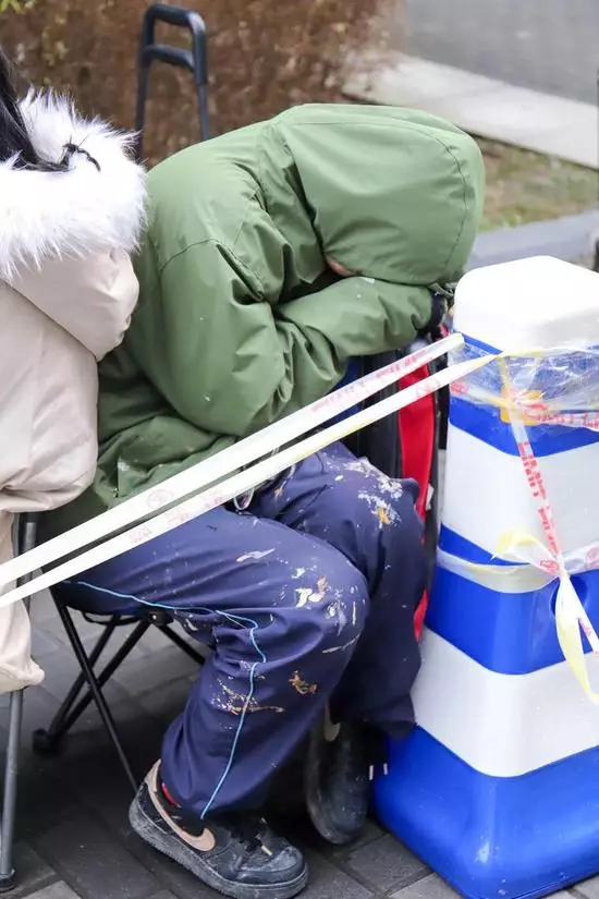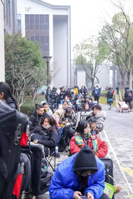 這幾天,省外高校設在杭州的藝考考點,比如杭師大和浙理工大,隨處可見穿著一身被顏料染得花花綠綠的考生。他們大多裹著厚厚的冬裝,冒著凜冽的寒風,身子縮在一張小凳子上打盹。有些長得漂亮的姑娘小伙,也完全不顧形象,蹲在地上吃著盒飯。