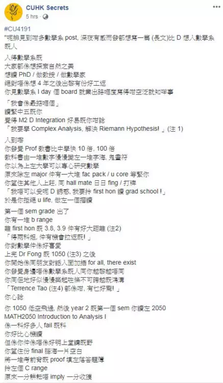 數學一直存在於我們生活四周,甚麼東西都「有得計」,以及有背後的藏著的真理。然而數學雖然日常,卻非常複雜,有中大數學系同學仔在社交媒體專頁「CUHK Secrets」發文,希望靠警世文勸退所有想入數學系的同學仔,指數學系毫不簡單兼消磨鬥志:「是但一科更稱心。」
