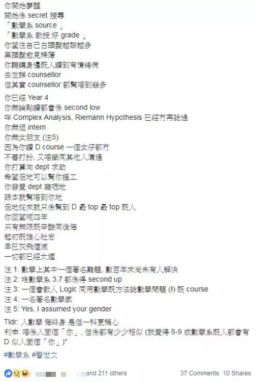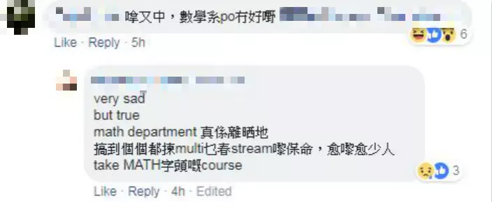 帖文引來10個分享以及235個讚好,當中有45人給予「喊樣」,而留言中又有不少人表示有同感,「嗱又中,數學系po冇好」、「very sad but true,math department真係離晒地,搞到個個都揀multi乜春stream嚟保命,愈嚟愈少人take MATH字頭嘅course」、「回頭是岸啊」、「得3.3係咪可以third hon QAQ」。
