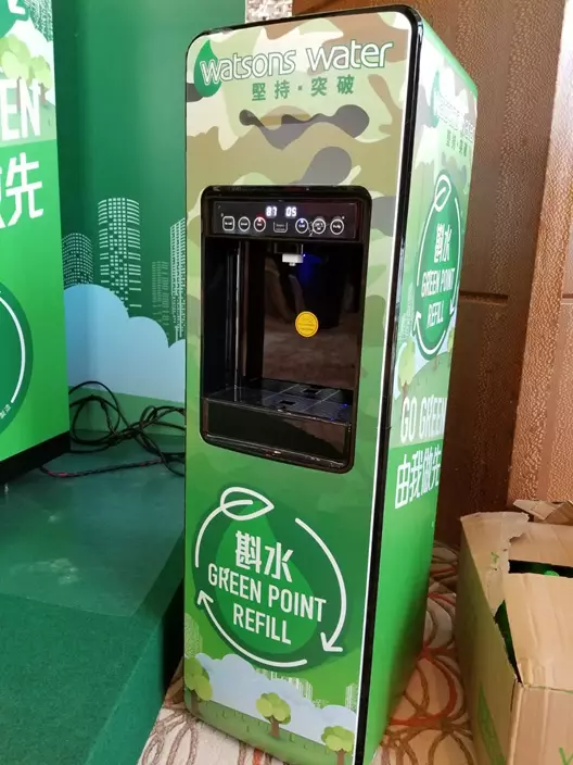 港人每日平均棄置五百萬個膠樽,為響應政府推動減廢回收,屈臣氏蒸餾水最快今年3月底起,在未來5年於全港增設400部智能膠樽回收機,可接收任何牌子的PET塑膠水樽,按樽可以儲分換取電子禮券或其他獎賞,回收的膠樽會交由回收再造商處理。另外又會在5年內推出100部斟水機,每100毫升蒸餾水,售價1元,鼓勵市民自備水樽;而二月的渣打馬拉松會率先試用智能斟水機及回收機。