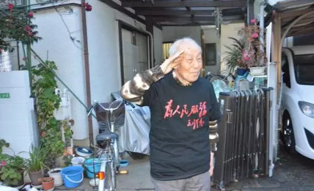 小林寬澄穿著印有「為人民服務」字樣的衣服在自家門前敬禮。(新華網)