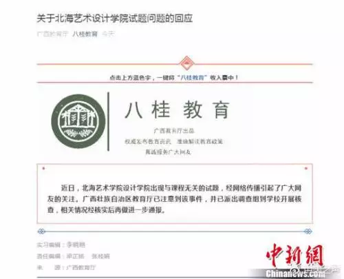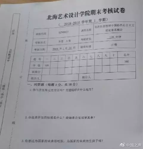 這些試題來自廣西北海藝術設計學院大一學生的《思想道德修養與法律基礎》試卷和大二學生的《毛概》考卷,試卷通篇充斥著諸如「青春期的你有什麼特徵?」這類的問題。據稱考題都由學院副院長鄭某出卷。而在上周,該科目其實已經進行過一次期末考試,並且試題與課本內容相符,這場「奇葩」考試屬於臨時加場的開卷考試。